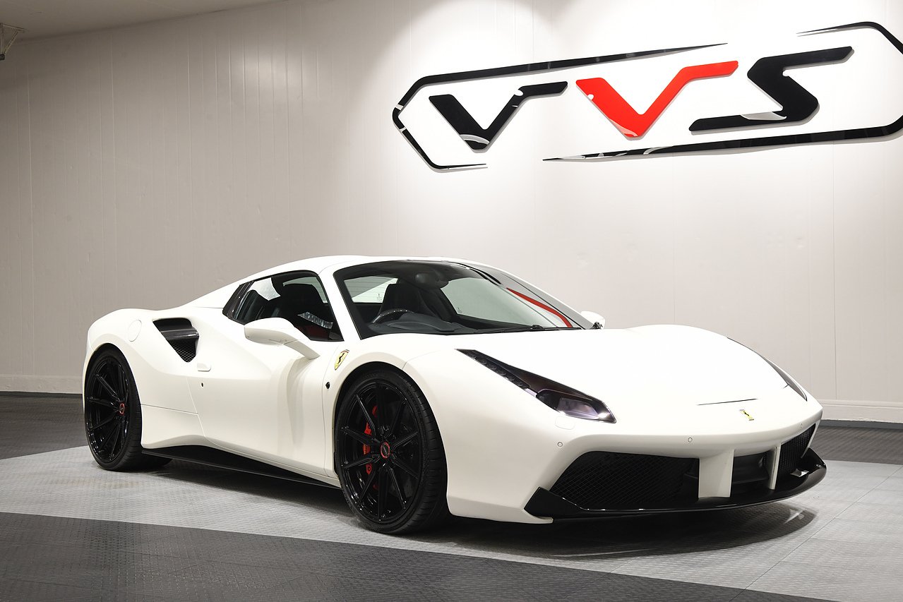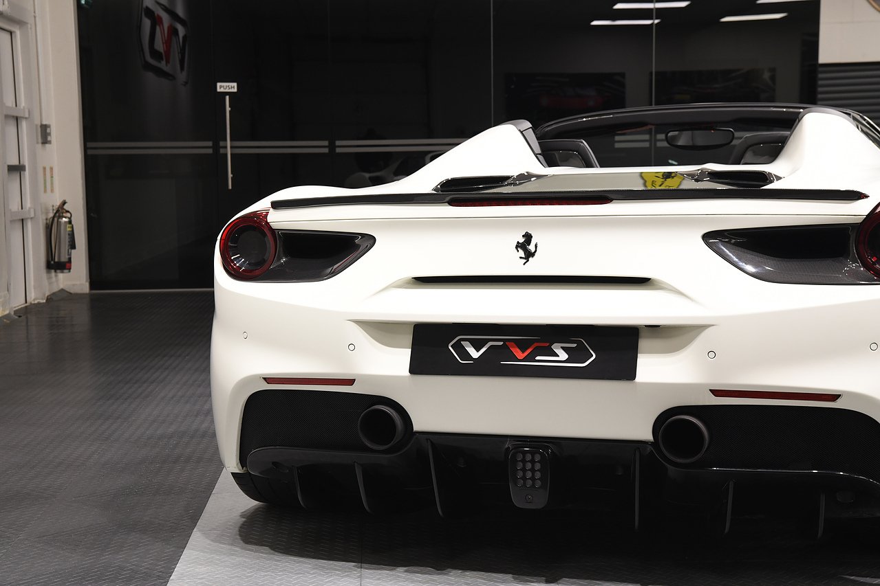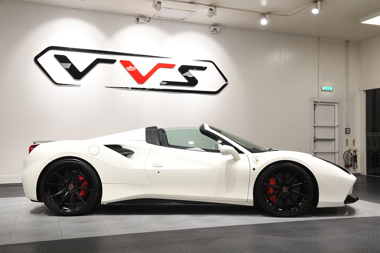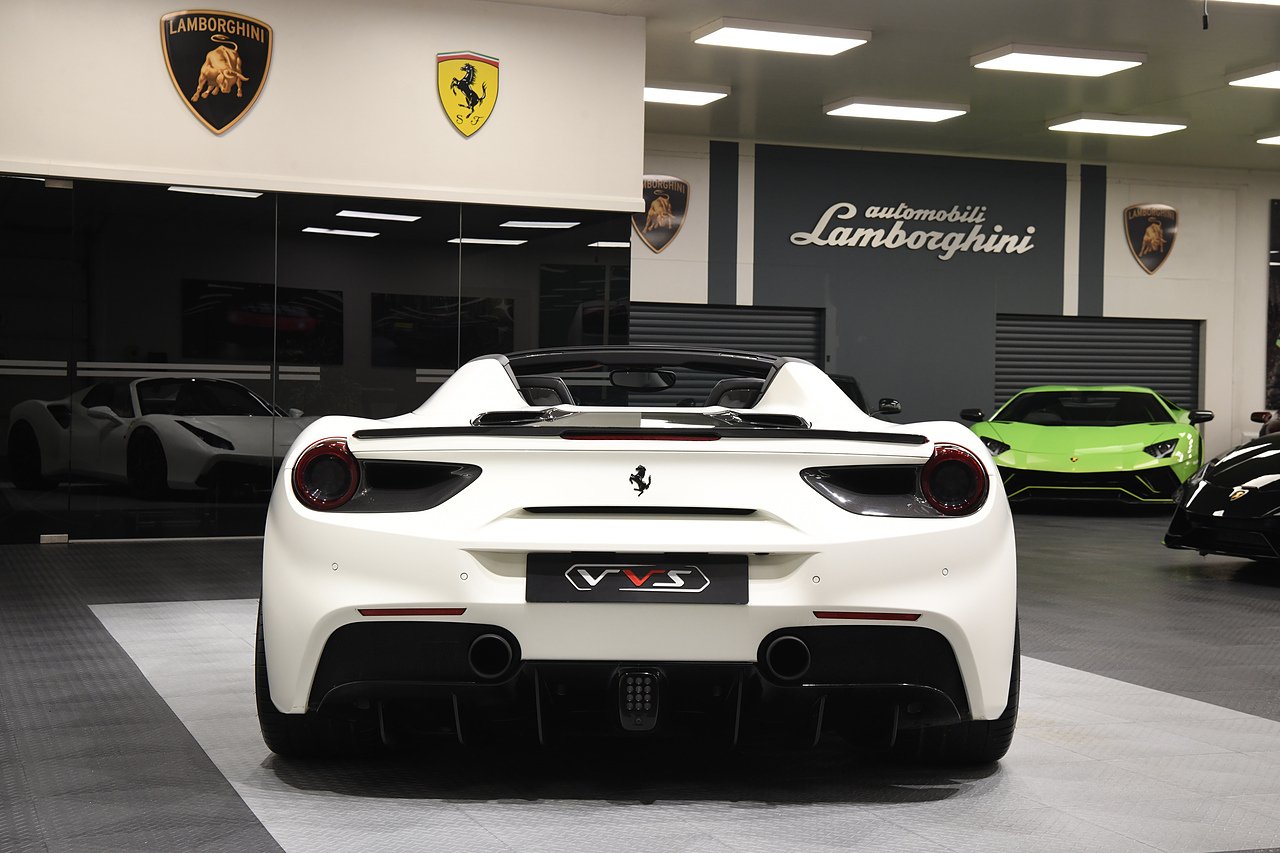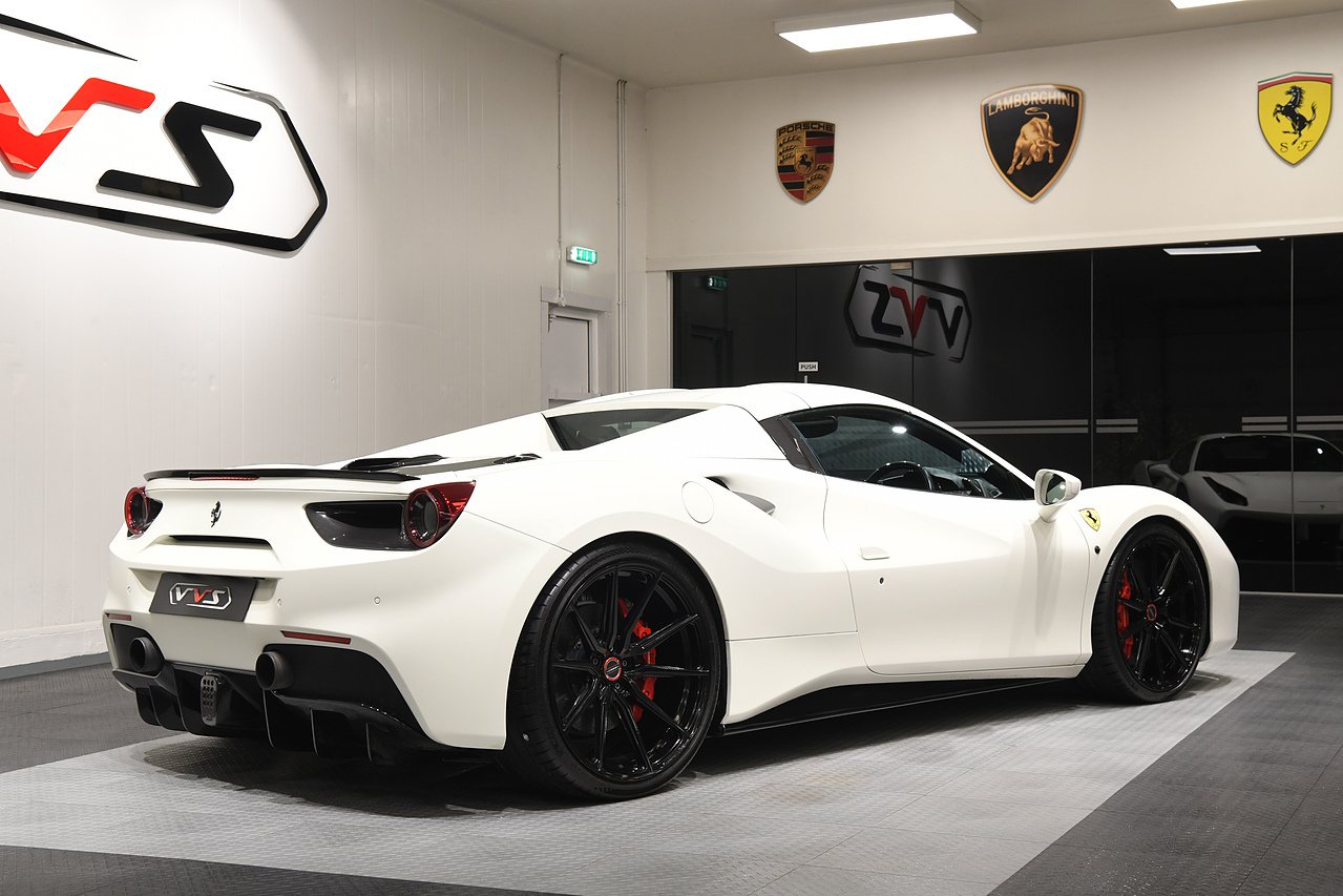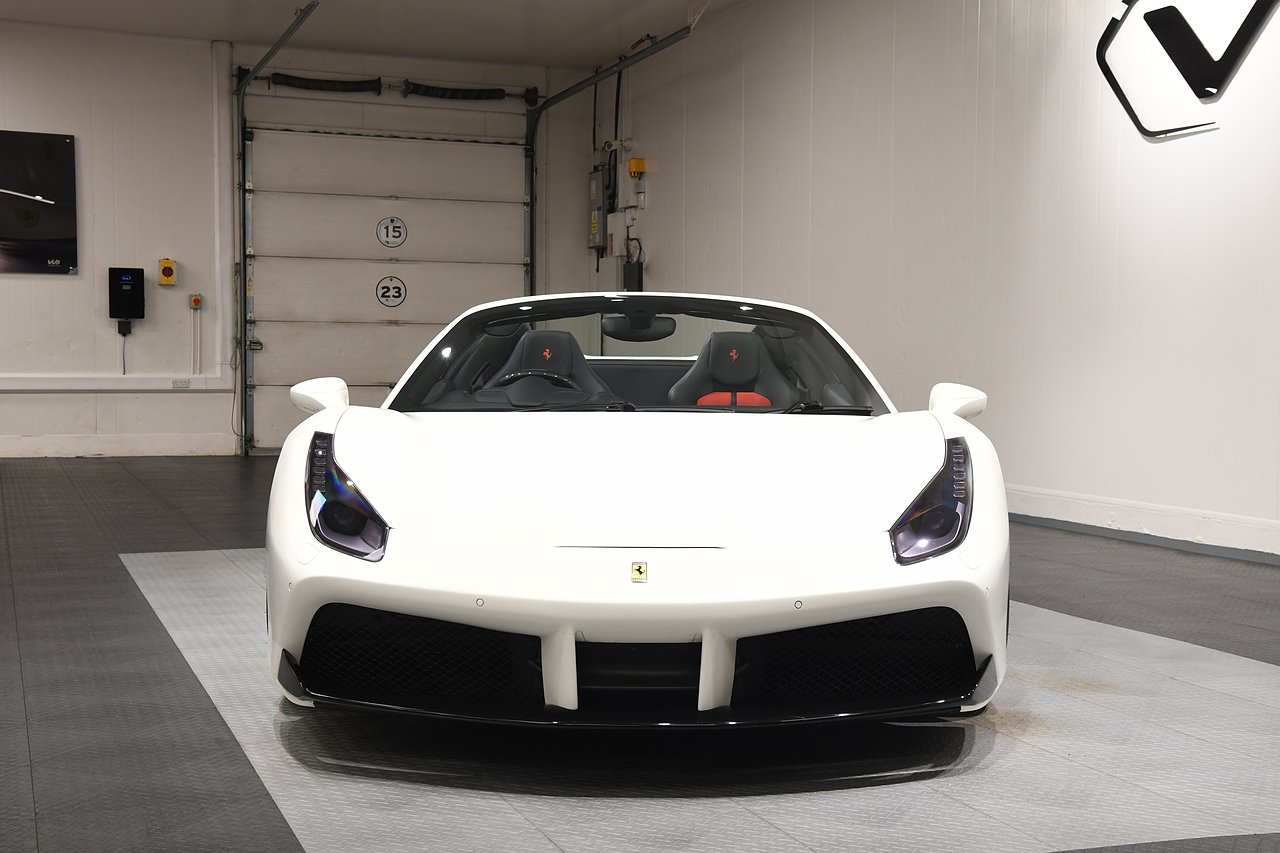 VVS are pleased to offer this 2018 Ferrari 488 Spider presented in Bianco Avus with Two tone Nero and Rosso leather/alcantara interior. This example is optioned with Carbon fibre race seats, Rosso cavallinos stitched into headrests, White rev counter, JBL sound upgrade, Carbon fibre driving zone with LEDS, Carbon fibre central bridge, Carbon fibre paddles, Carbon fibre dash inserts, Front parking sensors, rear view camera, Front lifting system, Scuderia shields, Outer Carbon fibre B-pillars, Carbon fibre rear air ducts, sports exhaust pipes finished in matte black, Capristo glass engine cover, Capristo exhaust with De cats, Novitec rear lip spoiler, Full stealth PPF, Rosso brake callipers, 21"/20" Vossen alloy wheels and full Ferrari service history from new.