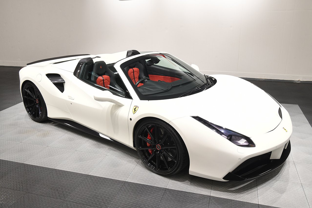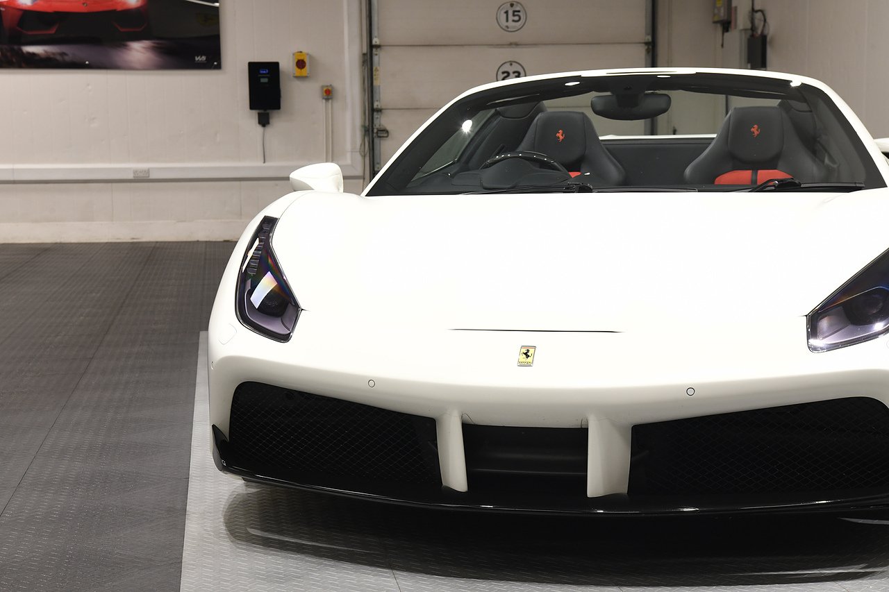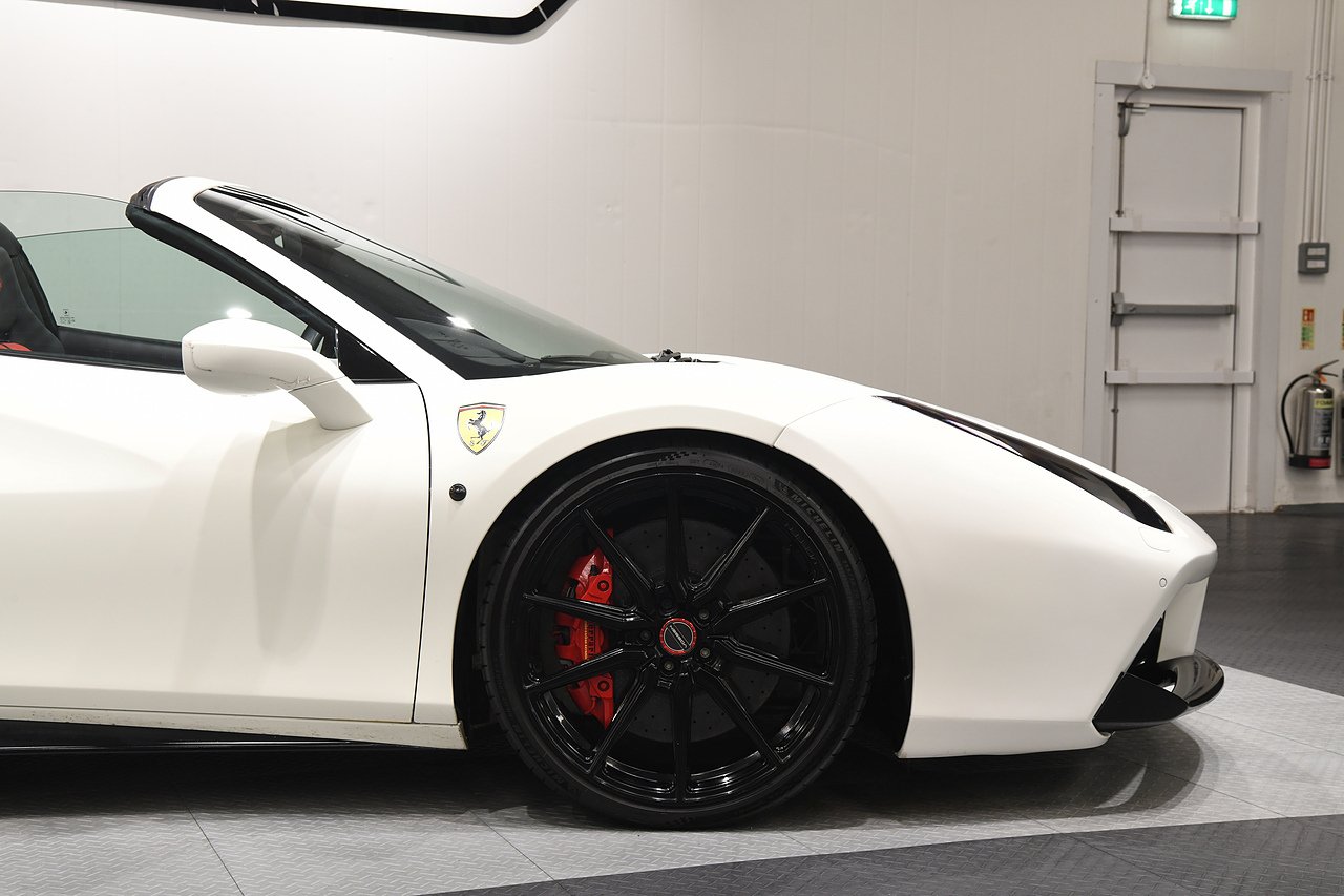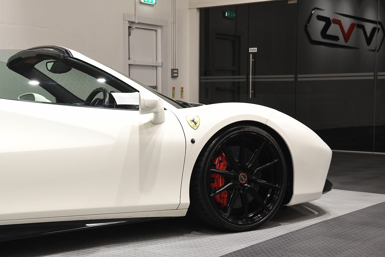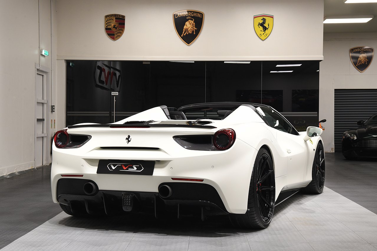 VVS are pleased to offer this 2018 Ferrari 488 Spider presented in Bianco Avus with Two tone Nero and Rosso leather/alcantara interior. This example is optioned with Carbon fibre race seats, Rosso cavallinos stitched into headrests, White rev counter, JBL sound upgrade, Carbon fibre driving zone with LEDS, Carbon fibre central bridge, Carbon fibre paddles, Carbon fibre dash inserts, Front parking sensors, rear view camera, Front lifting system, Scuderia shields, Outer Carbon fibre B-pillars, Carbon fibre rear air ducts, sports exhaust pipes finished in matte black, Capristo glass engine cover, Capristo exhaust with De cats, Novitec rear lip spoiler, Full stealth PPF, Rosso brake callipers, 21"/20" Vossen alloy wheels and full Ferrari service history from new.