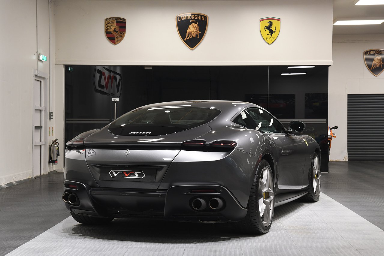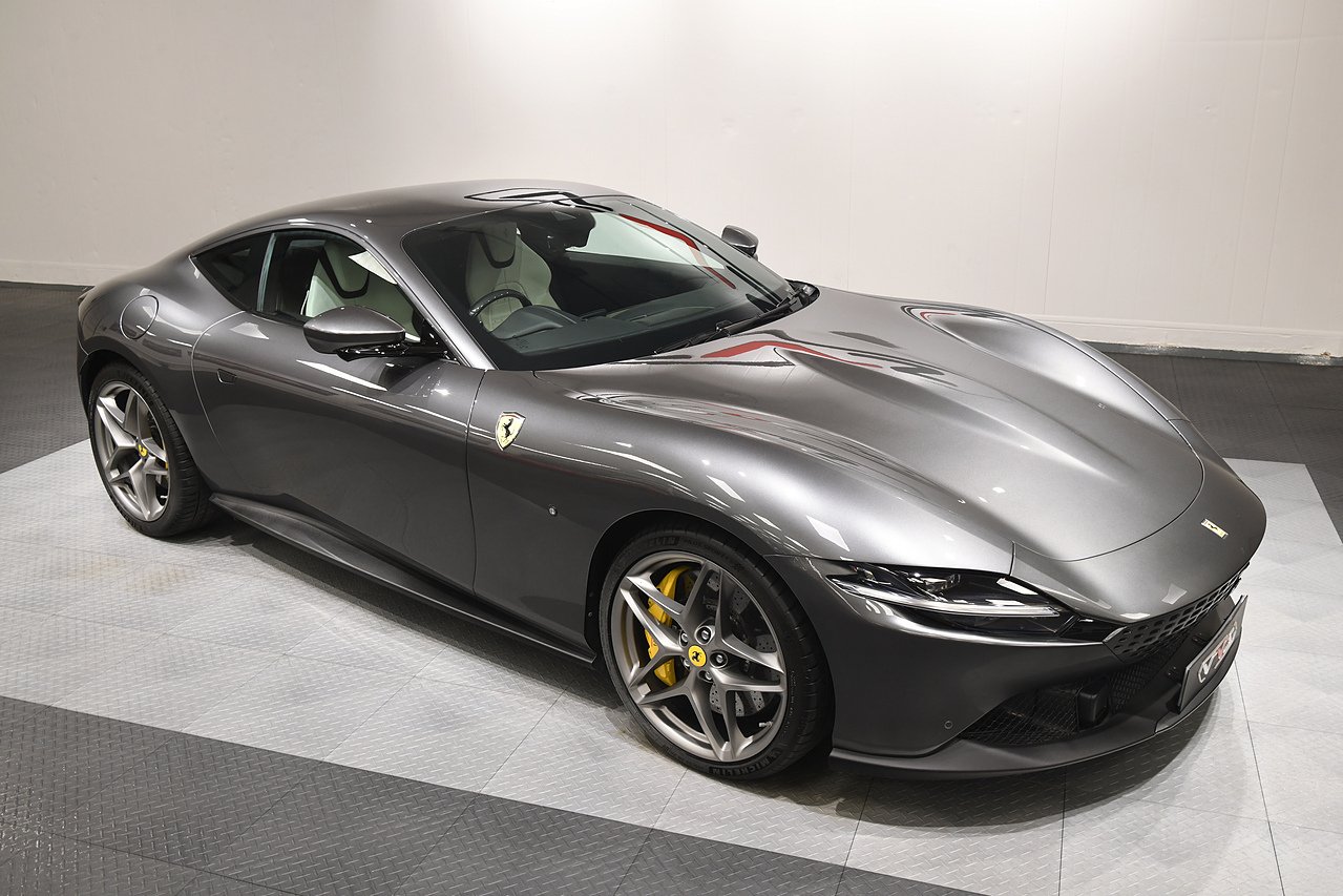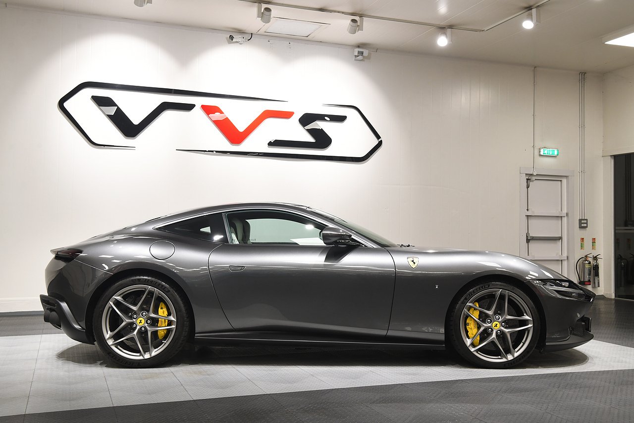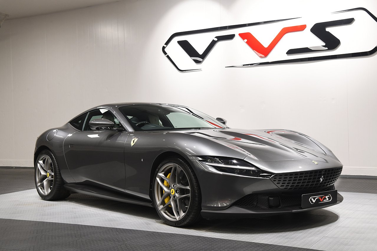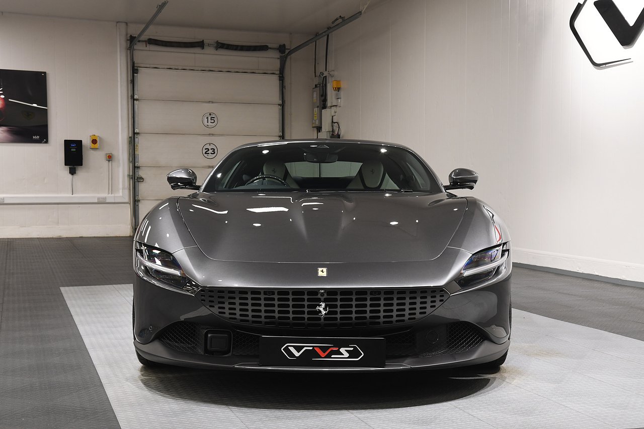 VVS are pleased to offer this 2021 Ferrari Roma presented in Grigio Silverstone with Semianilina leather interior and Grigio Scuro stitching. This example is optioned with Full electric Daytona seats, Cavallino stitched in headrests, Carbon fibre steering wheel with LED's, Heated steering wheel, Surround view cameras, Adaptive front light system, Apple car play, Wireless smartphone charger, Passenger display, JBL sound system, Aluminium kick plate, Exterior sill kick in Carbon, Scuderia shields, Black taipipe tips, Complete ADAS package, Dual mode Magna-ride suspension, Yellow brake callipers, Matte grey 5 twin spoke alloys and a full Ferrari service history including the balance of the extended Power15 warranty until August 2026.